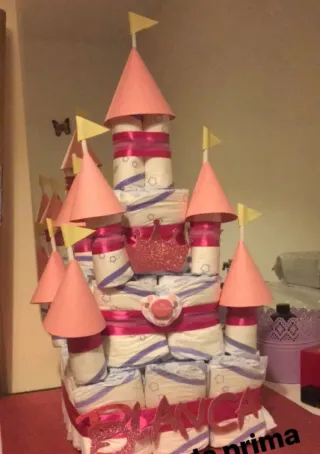 Original tarta de pañales con forma de castillo, carro ,moto tarta pisos globos etc ideal para regalar en un baby shower o nacimiento. Decorada con detalles diferentes según gustos . Preguntar precios desde 35 € según elección .