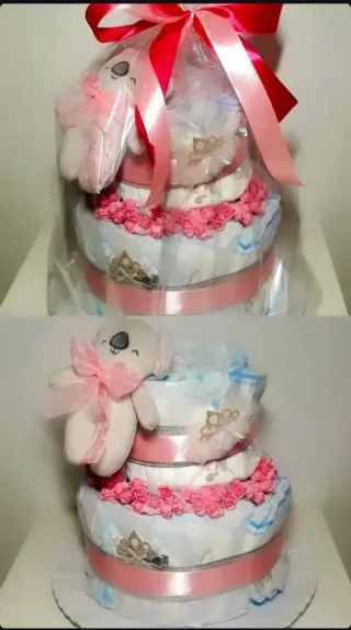 Preciosa tarta de pañales para bebé, ideal para regalar en un nacimiento o baby shower. Está compuesta por pañales, artículos de higiene y adorables juguetes. - Dos niveles de pañales. - Incluye juguetes de peluche. - Accesorios para el aseo del bebé. - Toallitas húmedas. - Presentación impecable. Precios a convenir en función de cantidad de pañales y complementos