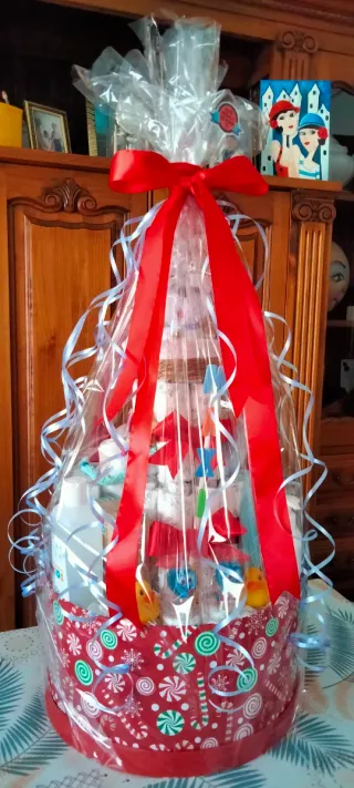 Original tarta de pañales, ideal como regalo. - Envuelto en celofán transparente. - Decorada con lazos rojos y cintas azules. - Base con estampado navideño de caramelos.