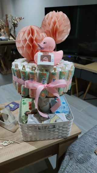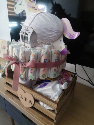 Se hacen tartas de pañales personalizadas, dime qué presupuesto tienes, qué modelo te gusta más y la adapto. Pueden contener todo lo que quieras (chupetes, mordedor, muselinas, juguetes interactivos, geles, toallitas, bodys...). Pregunta sin compromiso🙂 Entra en mi perfil para ver más modelos. SE HACEN ENVÍOS.