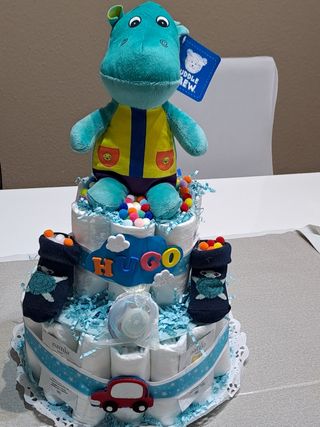 Preciosa tarta de pañales para bebé, ideal para regalar. Es una pieza única, hecha a mano con mucho cariño. Contiene,1 paquete de pañales dodot, babero,calcetines, productos nenuco, chupete ,nombre del bebé y demás adornos - Perfecta para un baby shower o nacimiento. - La tarta está decorada con un tierno osito de peluche.