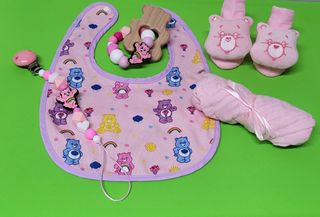 lote de bebe de los osos amorosos / care bear. esta compuesto; babero mordedor gasa pequeña calcetines chupetero. se entrega en caja de regalo. ideal para fiestas de baby showe , o para poner en tartas de pañales , canastilla , cestas de bebe , muñeco reborn