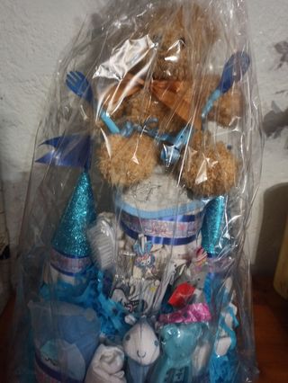 Tarta de pañales adaptada completamente a tus gustos. Se le puede añadir todo lo que tú quieras. La que se muestra en la foto se compone de 1 gel y 1 colonia de marca Muestela, 1 body, 1 pijama azul, 1 gasa, 1 paquete de toallitas de marca Dodot, 1 peluche y 58 pañales Dodot Sensitive, por un precio de 80€. Puede ir personalizada con su nombre, con las cintas del color que tú elijas y con un plástico transparente para proteger y, a la vez, ver el interior. El precio varía según los elementos de los que se compone. ¡Pregunta sin compromiso para más informacion!😊
