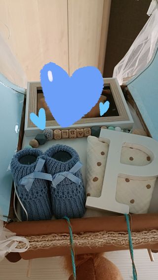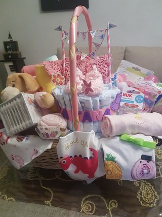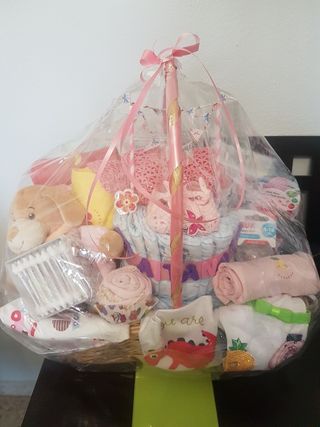 ¿Nacimiento a la vista? Pregúntame sin compromiso y te cuento. Estaré encantada de atenderte. Me adapto a la idea que tengas y al presupuesto que desees. El precio de la cesta varía en función de los productos que elijas. Tú lo imaginas y yo lo creo. Esta cesta está compuesta por: - Tarta de pañales - 2 Baberos - Mordedor - Gel, champú, loción y cremas - 3 bodies - Gasa de algodón - Rebeca de primera postura - Patucos - Conjunto + diadema - Biberón - Chupete con cadena - Dou dou - Bastoncillos - Cepillo y peine - Cesta personalizada con nombre y decorada. Desliza para ver más fotos.