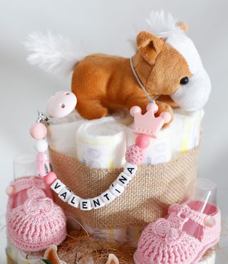Preciosa tarta de pañales para bebé, ideal para regalar. Incluye dos pisos con pañales, un tierno peluche con mordedor y babero. Perfecta para recién nacidos. - Adornos decorativos. - Ideal como regalo de nacimiento. Personalizada según el nombre del bebé.
