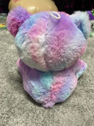 Adorable oso de peluche con un diseño tie-dye en tonos rosas y morados. Sostiene un corazón blanco con la palabra Love bordada. - Colores vibrantes: rosa, morado y azul. - Corazón decorativo con Love y detalles. - Textura suave y esponjosa.