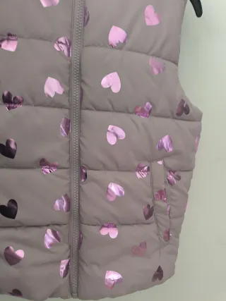 Chaleco infantil con un bonito diseño de corazones. - Color base malva. - Estampado de corazones en tonos rosas y morados. Talla 7-8 años (122-128)