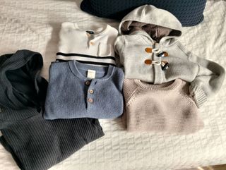 Conjunto de cinco jerseys de punto para bebé, perfectos para el invierno. Incluye prendas en tonos blanco, azul, gris claro, gris oscuro y beige. - Jersey blanco con detalles de rayas azul marino Kiabi. - Jersey azul de punto waffle con botones. - Chaqueta gris con capucha y cierres de toggles HM. - Jersey beige de punto liso HM. - Jersey gris oscuro con capucha Kiabi Talla3 * Las tallas de las 4 primeras prendas son entre 12 y 24 meses.