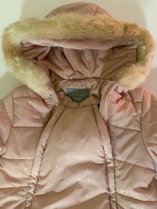 Buzo de bebé marca Coconut en color rosa, ideal para los meses más fríos. Talla 12-18 meses aunque talla grande. Totalmente nuevo. No uso previo. - Diseño acolchado. - Capucha con pelo. - Incluye manoplas y patucos. - Cierre frontal. Comprado en el corteingles.