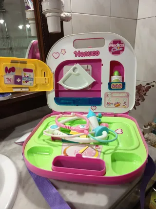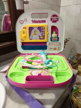 Maletín de juguete Nenuco para pequeños doctores. Incluye varios accesorios para jugar a ser enfermero. - Diseño en forma de maletín. - Colores rosa, verde y blanco. - Incluye estetoscopio, jeringuilla y otros accesorios médicos de juguete. Regalo micrófono princesas