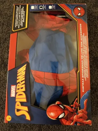 Disfraz de Spiderman Deluxe con accesorios, talla M (5-6 años). - Máscara con detalle de ojos lenticulares. - Incluye guantes. - Material textil nuevo con efecto brillante.