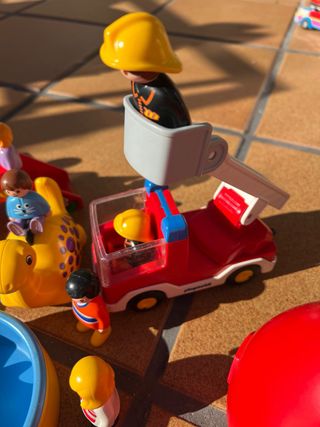 Lote variado de figuras y vehículos Playmobil Duplo. - Camión de bomberos rojo con escalera. - Figura de bombero con casco amarillo. - Figura de niño con camiseta naranja. - Figura de niño con jersey azul. - Figura de niña con vestido morado. - Figura de niño con casco amarillo. - Dinosaurio amarillo con manchas.
