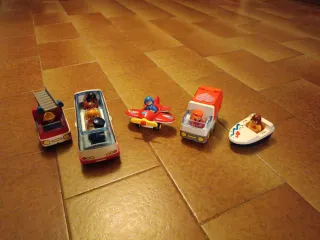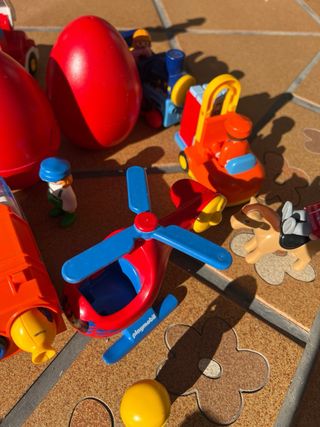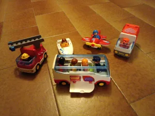 Conjunto de vehículos de Playmobil Junior. - Camión de bomberos con escalera. - Autobús con figuras. - Avión. - Camión. - Barco.