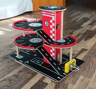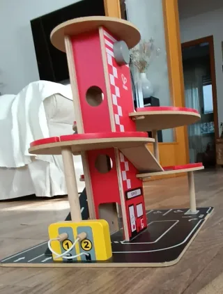 Parking de madera Hape para jugar. - Estructura de varios niveles. - Rampas de acceso. - Diseño de aparcamiento con detalles. En peefecto estado, sólo tiene un pequeño golpe en la plataforma superior de aterrizaje de helicópteros (se puede observar en la foto)