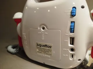 Equipo de karaoke infantil con diseño divertido y dos micrófonos. - Asa superior para fácil transporte. - Pantalla pequeña para información. - Botones de control de reproducción y volumen. - Altavoz integrado.