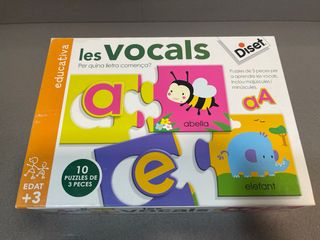 Juego educativo de puzzles de la marca Diset para aprender las vocales. Incluye 10 puzzles de 3 piezas cada uno. - Diseñado para niños a partir de 3 años. - Incluye vocales en mayúsculas y minúsculas. - Fomenta el aprendizaje de las vocales y vocabulario básico. - Juego en catalán.