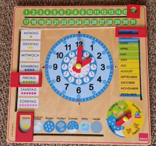 Un reloj y calendario de madera de la marca Goula. Estupendo para que los niños aprendan las horas, los días de la semana, los meses de año, las estaciones y el tiempo. Edad recomendada: 3 meses - 8 años. Dimensiones del producto: 47,5 x 3 x 47 cm; 600g