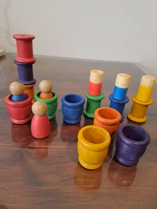 Material abierto que brinda la oportunidad de convertirse en lo que ellos deciden según el escenario del juego. Madera de haya teñida. A partir de los 10 meses. Ĺínea pedagógica Waldorf y Montessori. 6 barriles, 6 carretes y 6 nins. - Piezas de madera pintadas en varios colores. - Diseño inspirado en elementos cotidianos como carretes de hilo. - Figuras tipo nin con cabeza redonda y cuerpo cónico.