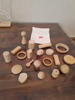 20 elementos de madera natural para la Cesta de los Tesoros, acompañados de una bolsita. Las maniras de los pequeños ven y tocan la calidez y naturalidad de estos materiales : su suave tacto, la textura de madera, los bordes redondeados, las esferas prrfectas... ofrecen una gran versatibilidad en el juego. Estilo Montessori.