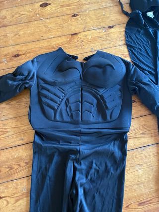 Disfraz de Batman para niño, ideal para fiestas o Halloween. Incluye traje y capa. - Traje negro con detalles musculosos. - Capa negra con capucha. - el cuello está un poco descosido -Talla 4-5 bien completa