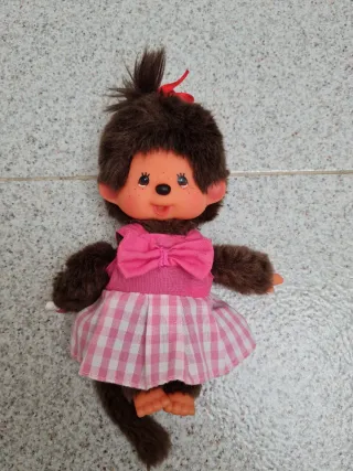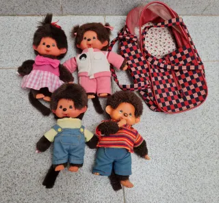Conjunto de cuatro adorables Monchichis, cada uno con su propio atuendo. - Incluye un bolso de transporte a cuadros rojos y negros. - Un Monchichi lleva un vestido rosa a cuadros. - Otro viste un conjunto rosa y blanco. - Uno más luce un peto vaquero azul y camiseta amarilla. - El último lleva una camiseta de rayas y pantalones cortos azules. El precio es por todo el pack. Un monchichi suelto cuesta 15€.