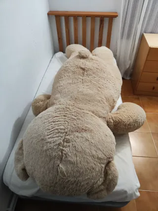 Este adorable oso de peluche es perfecto para abrazar. Su gran tamaño lo hace destacar. Super suave. Está como nuevo. Ningún rasguño. Perfecto como regalo San Valentín - Color: beige. - Lazo rojo en el cuello. - Corazón rojo bordado en la pata. Todavía lleva la etiqueta un poco deteriorada.