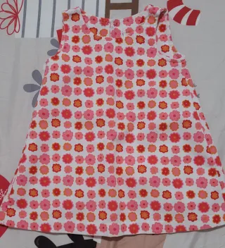 Vestido de bebé con estampado de flores en tonos rosas y anaranjados. Ideal para ocasiones especiales o para el día a día. - Diseño sin mangas. - Cuello redondo. - Estampado floral repetido. El precio es por cada prenda.