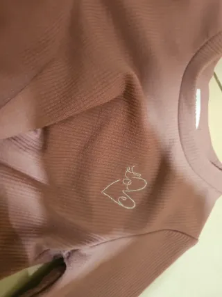 Conjunto de ropa para niña de 6 años. El tejido es de canalé y tiene un detalle bordado. - Color rosa palo. - Diseño con corazón y la palabra Love bordada.