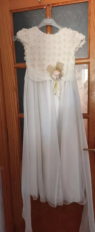 Vestido de comunión blanco, ideal para una ocasión especial. Presenta un diseño delicado y elegante. - Cuerpo adornado con pequeñas flores y pedrería. - Cintura marcada con un detalle de lazo y flores. - Falda larga y vaporosa de tela ligera. - Mangas cortas con volantes.