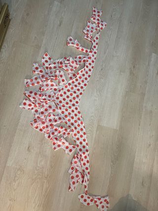 Disfraz de sevillana con estampado de lunares rojos sobre fondo blanco. El diseño incluye volantes en los bordes. - Tejido ligero y vaporoso. - Estampado de lunares. - Volantes decorativos.