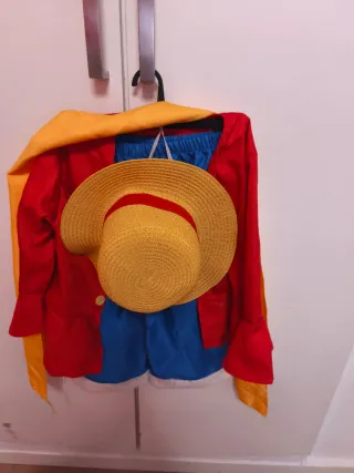 Disfraz inspirado en Monkey D. Luffy de One Piece, ideal para cosplay o fiestas temáticas. Incluye sombrero. - Chaqueta roja con detalles. - Pantalones cortos azules. - Sombrero de paja. - Capa amarilla.