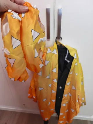 Disfraz inspirado en Zenitsu Agatsuma, personaje de anime. - Kimono de color amarillo con patrón de triángulos blancos. - Incluye traje negro debajo del kimono.