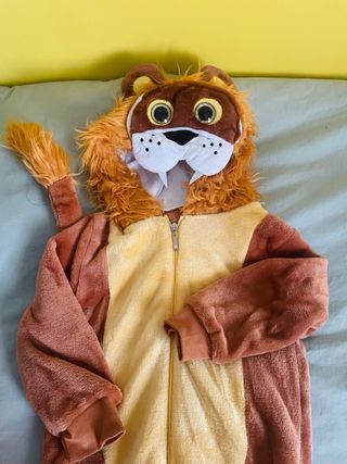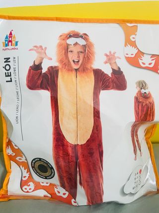 Disfraz de león de tres piezas, hecho y pintado a mano. - Talla 3. - Incluye capucha con melena y traje completo. La capucha se saca con botones. - Material suave y cómodo. - Hecho a mano y pintado para simular más realista. - Impecable.