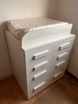 Precio negociable. Cómoda blanca con cajones para utilizar de cambiador infantil. 8 cajones. Incluye cambiador de madera, cojin y fundas de cambiador. Materiales de calidad, interiores de cajones forrados. Todo en buen estado. Se puede entregar desmontado. Medidas: Cómoda: 80 ancho x 62 fondo x 85 alto. Cambiador: 55 ancho x 75 largo cajones: 42x33. hay 4 mas pequeños (15cm) y 4 mas altos (24cm)