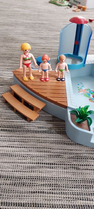 Conjunto de piscina de Playmobil con varios accesorios y figuras para horas de diversión. - Piscina con tobogán y escaleras. - Figuras de niños y adultos. - Colchoneta inflable y flotador. - Aros y otros accesorios de juego.