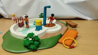 Set de piscina de Playmobil con figuras y accesorios para horas de diversión. Lo que se ve en la foto es lo que se vende. Se puede llenar de agua para darle mas realismo. - Incluye tobogán y tumbonas. - Figuras de personas y accesorios de playa. - Parasol y plantas decorativas.