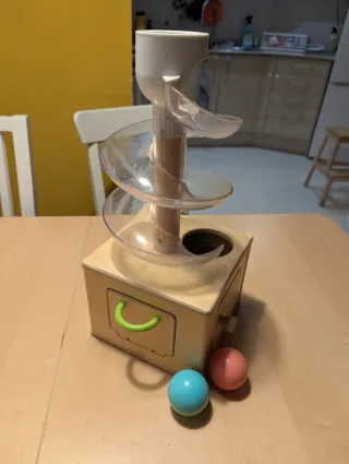 Juguete Lovevery Slide & Seek con tobogán de espiral y base de madera. - Incluye dos bolas de colores. - Base de madera con puerta y asa. - Tobogán de plástico transparente. En perfecto estado.