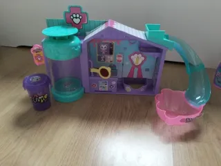 Divertido juguete de clínica veterinaria con accesorios. - Incluye un recipiente de slime morado. - Estructura de clínica con tobogán y accesorios. - Colores morado y turquesa.