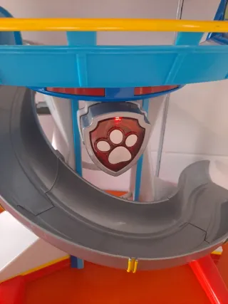 Torre de vigilancia de la Patrulla Canina con tobogán. - Diseño inspirado en la serie. - Colores rojo, azul y amarillo. - Incluye detalles como el escudo de la Patrulla Canina. Autobús patrulla canina. En perfecto estado. Ascensor interior, rampas para vehículos. Ambos juguetes con sonidos de la patrulla canina.