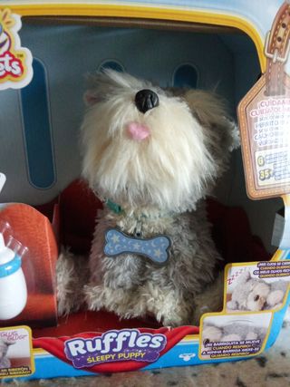 Cachorrito interactivo Little Live Pets, modelo Ruffles Sleepy Puppy. Este perrito de peluche responde a tus cuidados y emite sonidos. - Incluye biberón para darle de comer. - Mueve su barriguita al respirar. - Sus ojos se cierran al dormir. - Emite más de 35 sonidos diferentes.