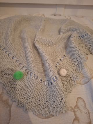 Preciosa toquilla clásica para bebé hecha a mano. Se entrega en una caja, ideal para regalo. - Diseño de punto con detalles calados. - Adornada con pequeños pompones de colores. - Acabado con borde festoneado.