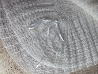 Preciosa toquilla tejida en color beige, con un diseño delicado y elegante. - Tejido de punto con trenzas. - Borde de encaje calado. - Lazos de cinta de satén en las esquinas.