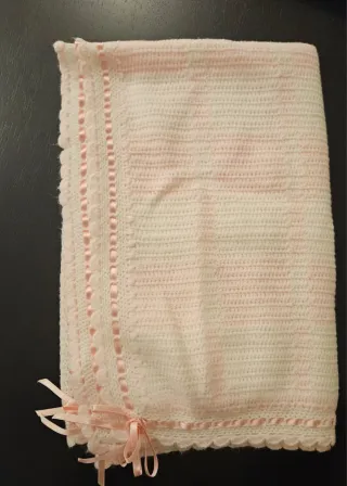 Preciosa toquilla de punto para bebé niña, ideal para mantenerla abrigada con estilo. - Tejido blanco de punto con detalles calados. - Adornada con delicados lazos de cinta rosa. - Diseño tierno y suave.