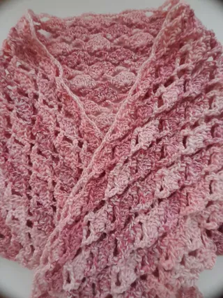 Preciosa pañoleta o toquilla tejida a crochet en tonos rosas, ideal para niñas de 4 a 10 años - Diseño delicado y artesanal. - Aporta un toque coqueto a cualquier conjunto. - Perfecta para usar como accesorio o para abrigar suavemente.