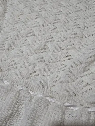 Toquilla de bebé tejida en color blanco roto, con un delicado diseño calado. Tejido suave y transpirable.Borde con detalle de puntilla.Por 5 euros en Ogijares( Granada) puedo enviar