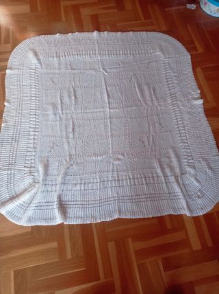 toquilla rosa bb, combinada calado con topos. Fabricada en españa, 100% algodon. Es fina pero caliente y agradable. 110x130 usada 1 vez para unas fotos, lavada y en perfectas condiciones.