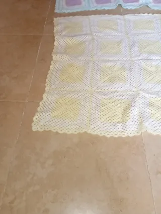 Conjunto de dos mantas tejidas a crochet, perfectas para bebés. Diseños delicados y artesanales. Medidas 78 x 78 CMS Ideal bebe recién nacido hospital toquilla Super suaves - Manta superior: tonos pastel (rosa y azul claro). - Manta inferior: tonos pastel (amarillo y blanco). - Borde festoneado en ambas mantas.