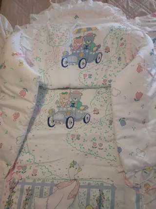 Conjunto de ropa de hogar para bebé, consta de edredón para cuna con chichoneras , saco para carro de bebé, toquilla y arrullo. En perfecto estado.