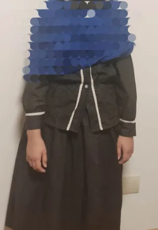 Falda, camisa, delantal, calcetines. Azul marino y puntos blancos. Toquilla negra.