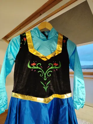 Disfraz completo de Ana de Frozen, inspirado en el personaje de la película. - Vestido largo azul con detalles florales. - Cuerpo negro con adornos dorados y bordados. - Mangas largas y cuello alto en color azul claro. - Incluye toquilla rosa - incluye peluca peliroja